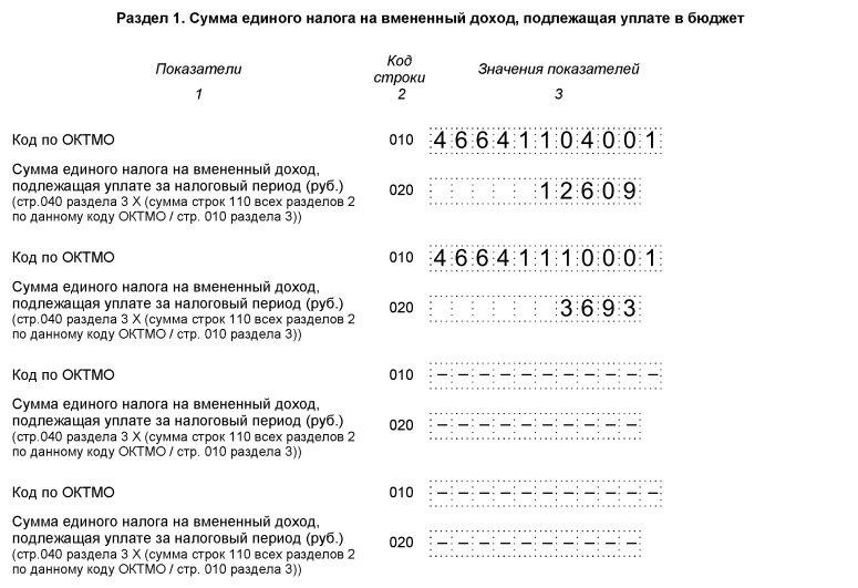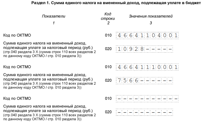 В разделе 1 отражаются рассчитанные в разделах 2 и 3 суммы налога к уплате. Если деятельность велась на территориях, юрисдикцией которых являются разные налоговые инспекции, то сумму налога ставят для каждого ОКТМО. Чтобы найти это значение в общей сумме налога, показатель строки 050 раздела 3 умножают на отношение суммы налога по одному ОКТМО к общему ЕНВД за налоговый период.