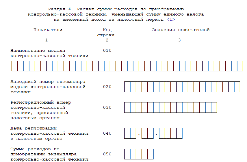 Форма утверждена Приказом ФНС РФ № ММВ-7-3/414@ от 26.06.2018. Этим же приказом утвержден порядок заполнения декларации по ЕНВД. По сравнению с предыдущей версией в отчете появилась таблица для заполнения данных о применяемой ККТ: на основе этих данных ИП вправе уменьшить сумму налога. Раздел 4 выглядит так.