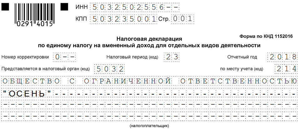 - если код ОКТМО меньше 11 знаков, то порядок заполнения декларации по ЕНВД требует заполнять ячейки слева направо, а в клетках, где пустые знакоместа, — ставить прочерки (25003451– – –). То же самое касается ИНН;
