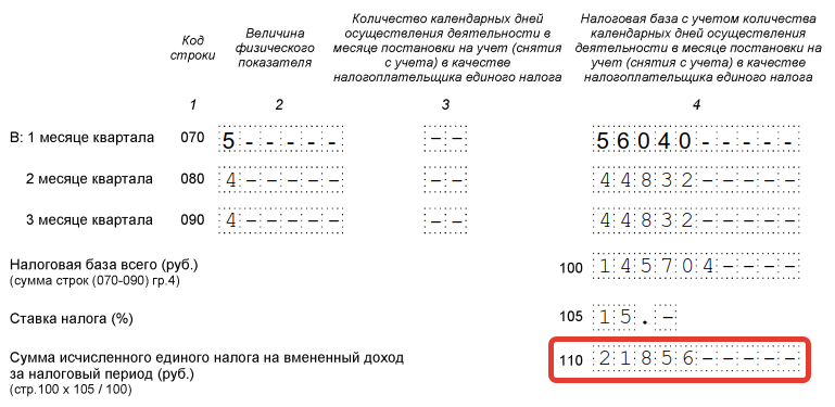 Чтобы найти сумму за квартал, сложите полученные показатели за все три месяца, а затем умножьте эту сумму на налоговую ставку 15%. Результат показывают в строке 110.