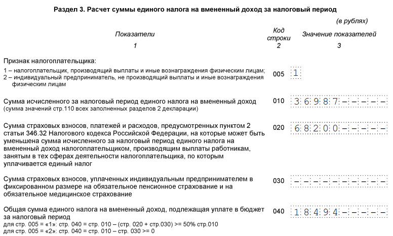 Имейте в виду, формируя отчет: существует возможность уменьшения рассчитанного квартального налога на сумму уплаченных индивидуальным предпринимателем с наемными работниками страховых взносов. В этом случае правильно показать уменьшенный на 50% единый налог.