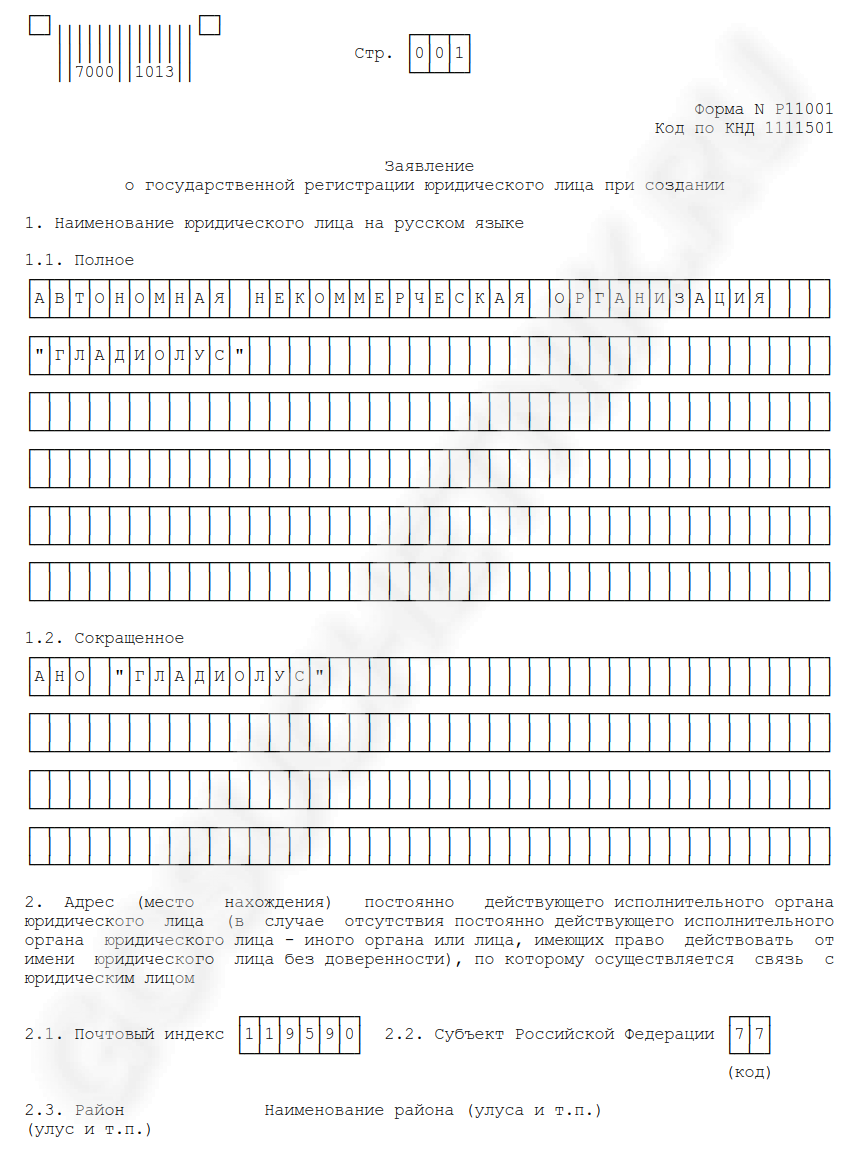 Для регистрации юрлица потребуется заполнить унифицированный формуляр Р11001. Бланк и правила заполнения закреплены Приказом ФНС России от 25.01.2012 № ММВ-7-6/25@. |