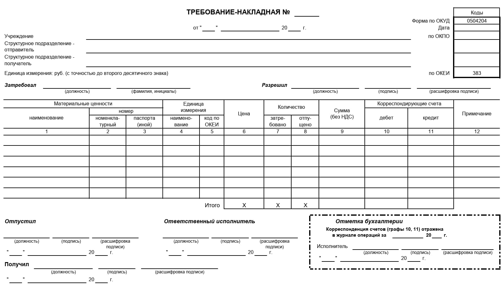 Бюджетные учреждения заполняют другую форму требования-накладной — ее код по ОКУД 0504204 (Приказ Минфина № 52н от 30.03.2015). Унифицированная форма обязательна, бюджетники не вправе использовать собственный бланк.