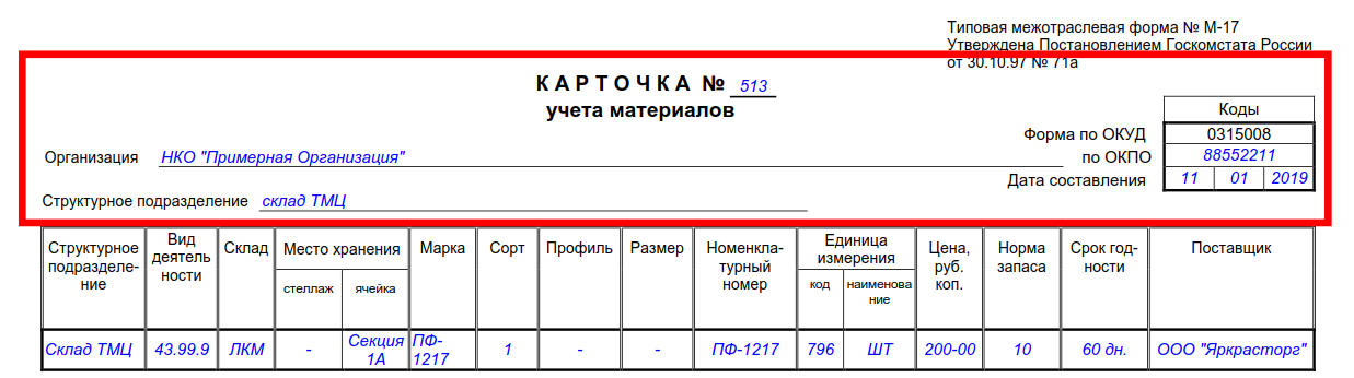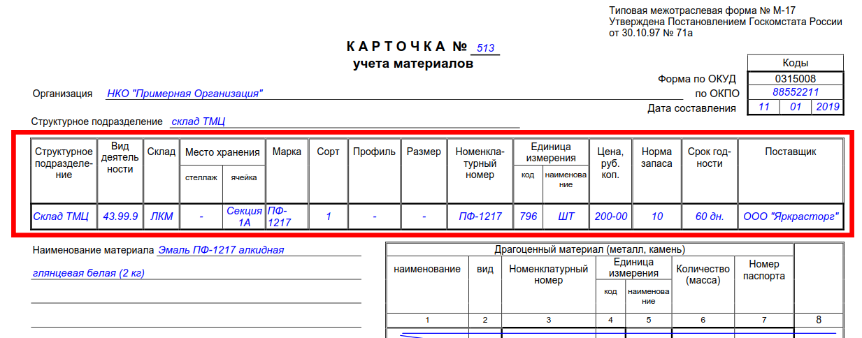 Заполнение карточки складского учета материалов осуществляйте с учетом рекомендаций: