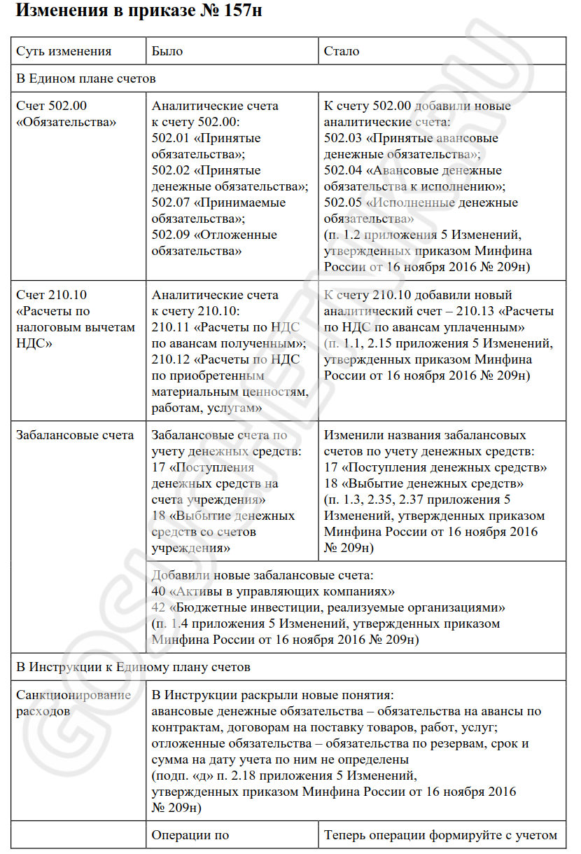 Минфин России приказом от 14.09.2020 № 198н обновил приказ 157н и единый план счетов. Приказ отправлен на регистрацию в Минюст и еще не вступил в силу. Планируется, что все изменения начнут действовать с 01.01.2021 и будут применяться при составлении годовой бухгалтерской отчетности.