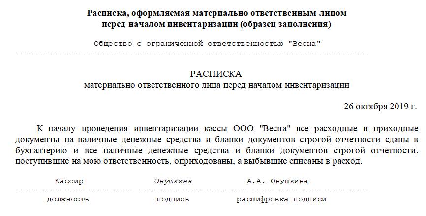 Помимо отчетов и первичной документации необходимо получить от материально ответственных лиц расписки. В расписке следует указать, что: