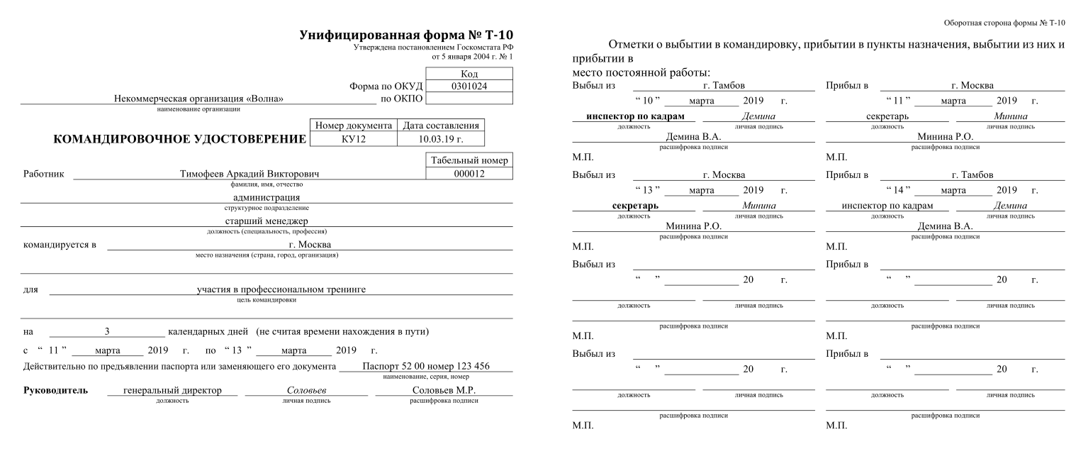 Далее необходимо заполнить сведения о сотруднике, направляемом в командировку, и рабочей цели поездки. На лицевой части указываются следующие сведения: