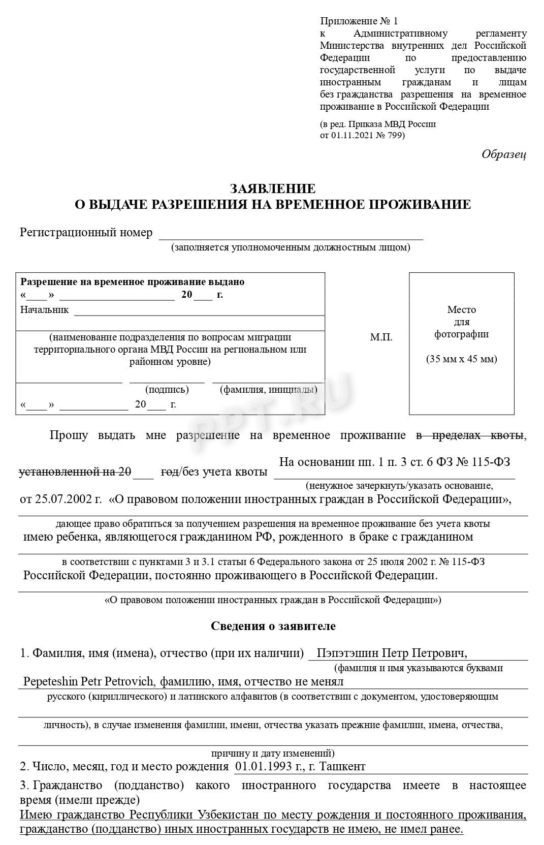 Заявление на получение РВП заполняется по форме, утвержденной в приложении № 1 к Приказу МВД № 407. Предлагаю ознакомиться с заполненным образцом заявления и скачать бланк для заполнения: