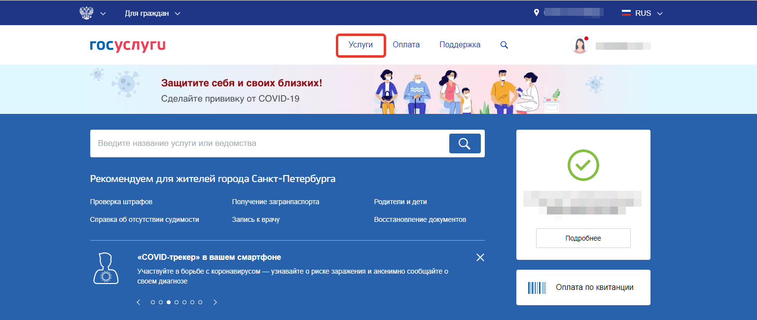 Шаг 2. На главной странице войти в раздел «Услуги».