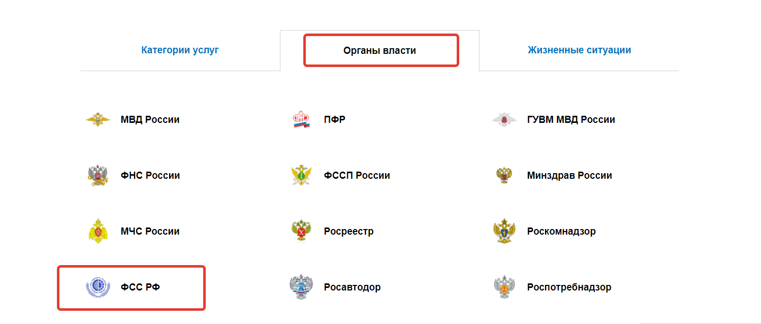 Шаг 3. Выбрать раздел «Органы власти», а в нем подраздел «ФСС РФ».