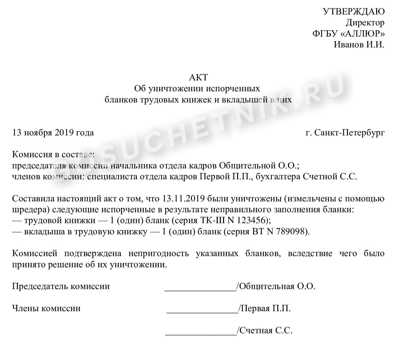 В соответствии с п. 42 постановления № 225, бланки, испорченные при заполнении, подлежат утилизации. Поскольку речь идет о документе строгой отчетности, прежде чем непосредственно уничтожать, необходимо его правильно списать, а именно: составить акт, в котором перечислить номера всех уничтожаемых бланков, вклеив в него вырезанные номера. Акт не имеет жестко установленной формы.