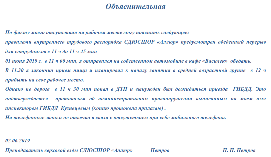 Для наглядности рассмотрим оформление взыскания на примере. Преподаватель по верховой езде Петров Петр Петрович не явился на запланированное занятие по конкуру, чем подверг малолетних воспитанников, пришедших на тренировку и оставшихся без присмотра, опасности.