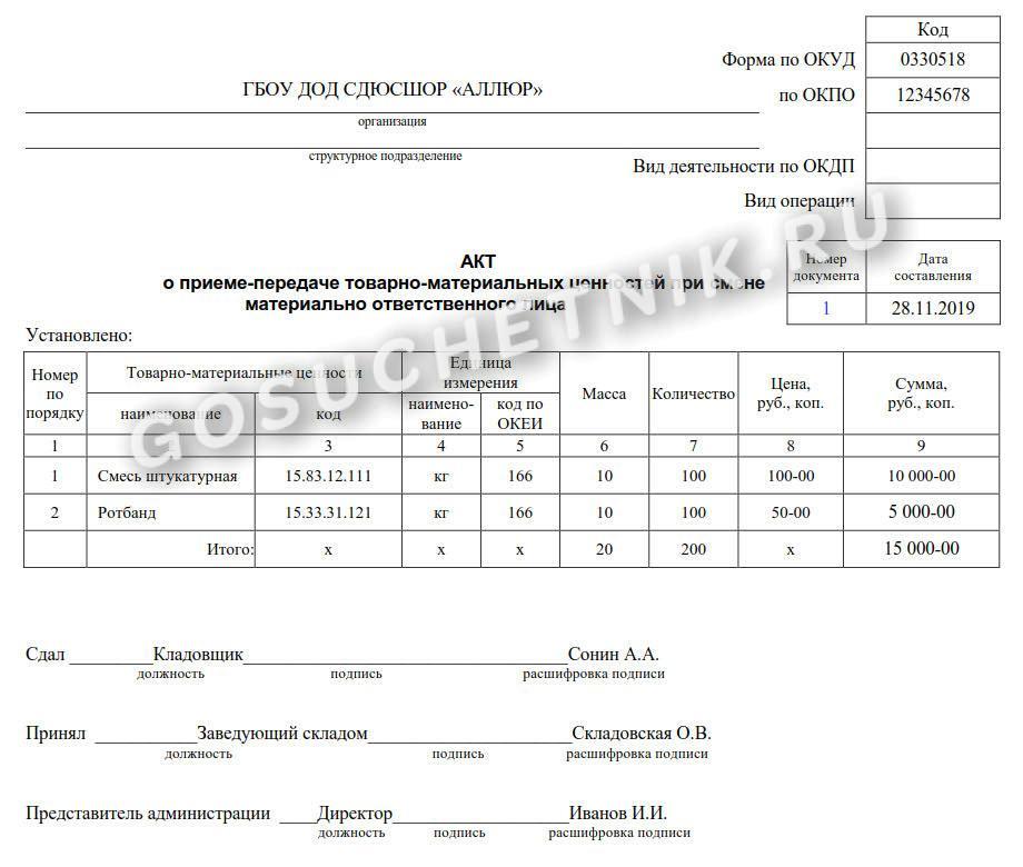 - Ценности передаются другому сотруднику по специальному документу — акту приема-передачи.