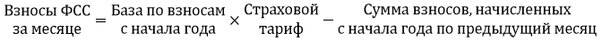 Взносы на страхование от несчастных случаев на производстве и профзаболеваний рассчитываются ежемесячно на последнее число по формуле: