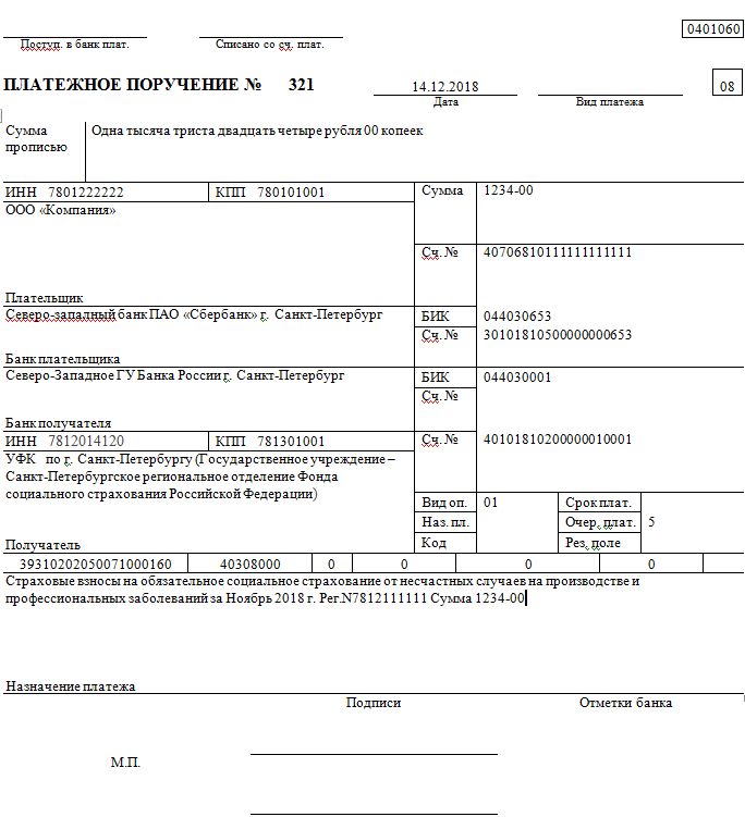 | 24 — назначение платежа | В этом поле следует указать вид соцвзноса, период, за который он уплачивается, и регистрационный код компании в ФСС |
