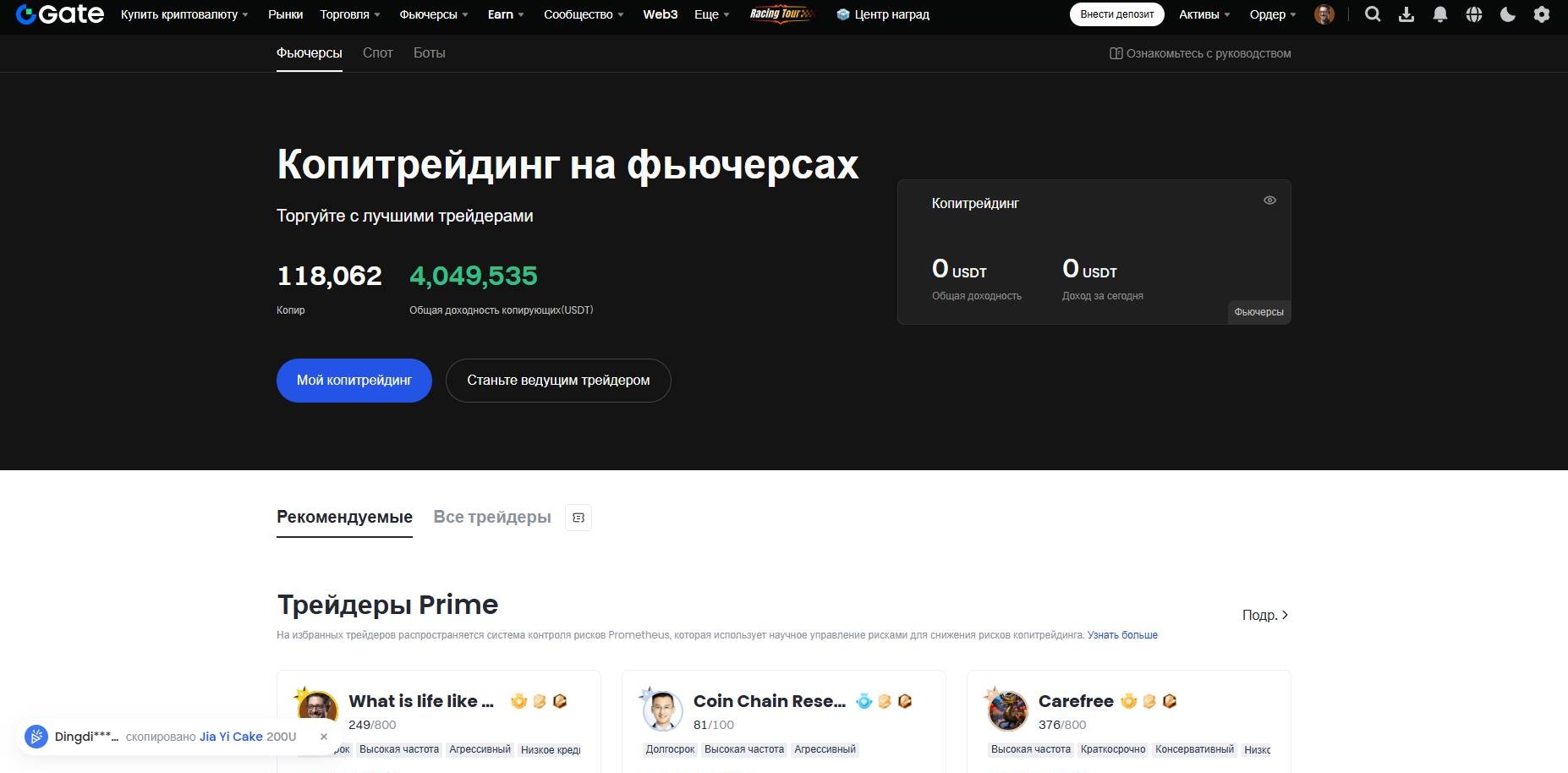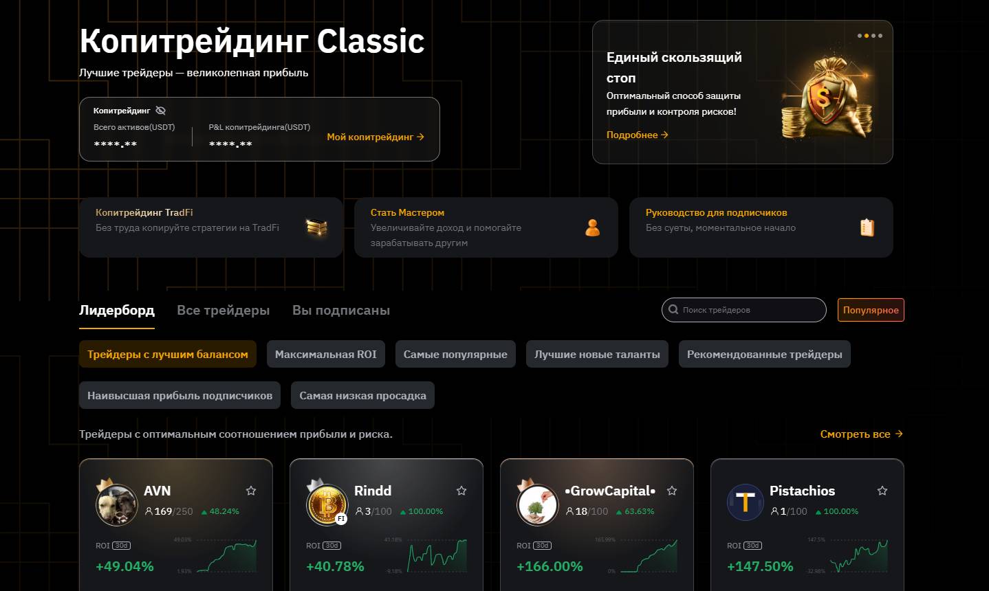 В личном кабинете есть отдельный раздел с копитрейдерами. Он так и называется — «Копитрейдинг». Там отображаются десятки профилей: у каждого есть доходность за последние 7 и 30 дней, количество подписчиков, уровень риска, общий объём активов под управлением.