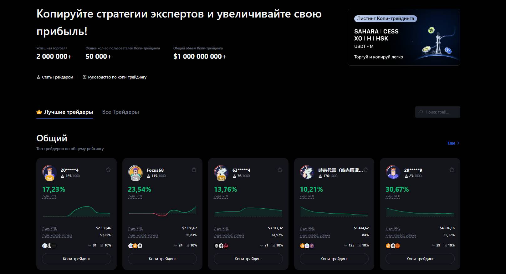 - Детальная статистика по каждому трейдеру: доходность за 7 и 30 дней, количество подписчиков, просадка.