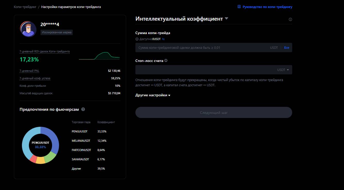Когда нажимаешь «Следовать» (на MEXC это кнопка находится напротив трейдера), открывается окно с параметрами. Я указал:
