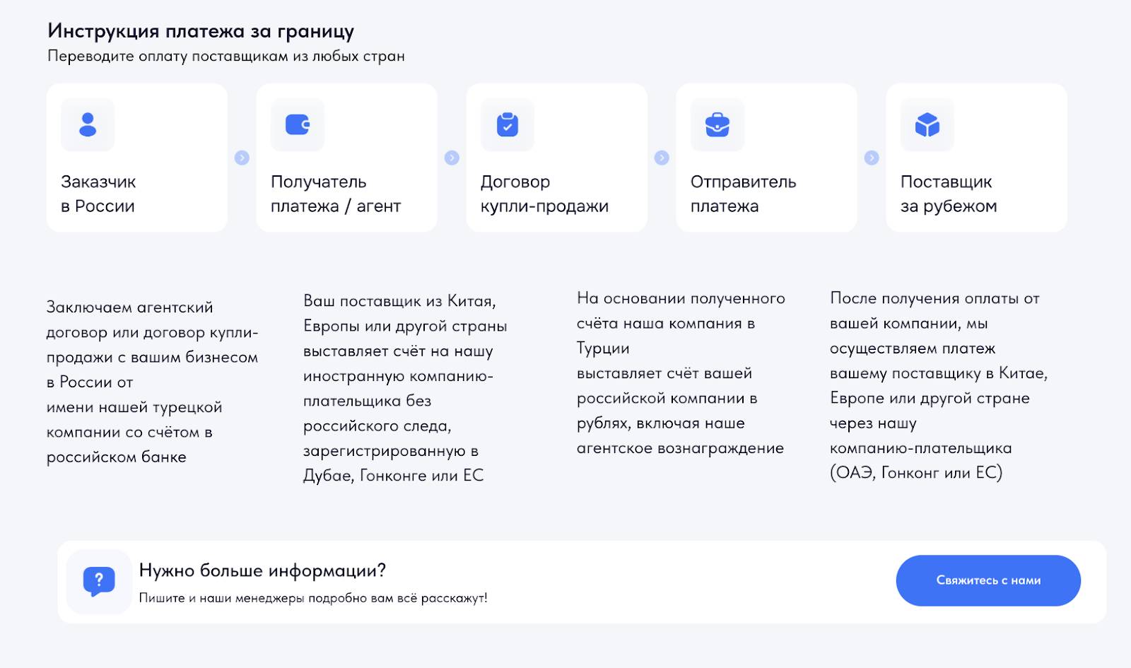 Так работает модель платёжного агента. Это особенно удобно, если вам необходимо оплатить инвойс в Китае, Турции, ОАЭ или другой стране, где прямой перевод из России невозможен или сопряжён с рисками. Всё оформляется в рамках российского законодательства, а платёж проходит без задержек.