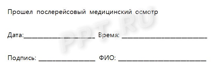 «Прошел послерейсовый медицинский осмотр».Дата _____ Время __________Подпись медработника ________