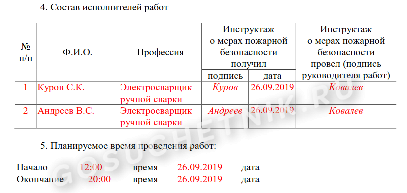 Пункт 4 — перечень исполнителей с указанием Ф.И.О., должностей, даты и данных лица, которое провело с ними инструктаж.