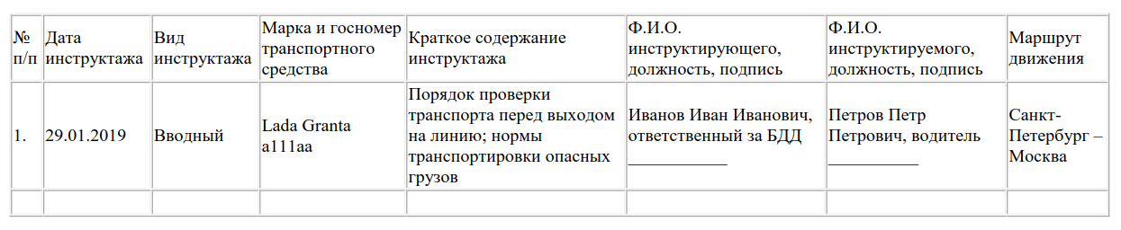 В журнал предрейсового инструктажа по БДД включаются данные о каждом инструктаже перед выходом в опасные рейсы. Например, его проводят перед первым выходом на определенный сложный маршрут, перед работой в колонне автомобилей, перед транспортировкой опасных грузов.