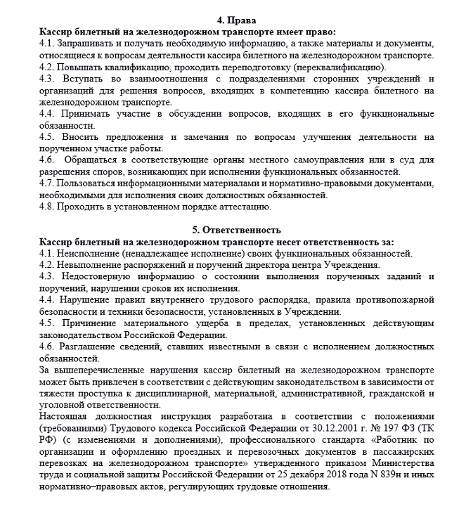 Должность «кассир» (контролер, кассир-контролер, иные работники, выполняющие трудовые функции кассиров (контролеров)) включена в Перечень должностей и работ (замещаемых или выполняемых), с которыми работодатель заключает письменные договоры о полной индивидуальной материальной ответственности за недостачу вверенного имущества (Постановление Минтруда России №85 от 31.12.2002). В остальном все имеющиеся права и обязанности кассира, его ответственность описываются в соответствующем разделе ДИ традиционным образом.