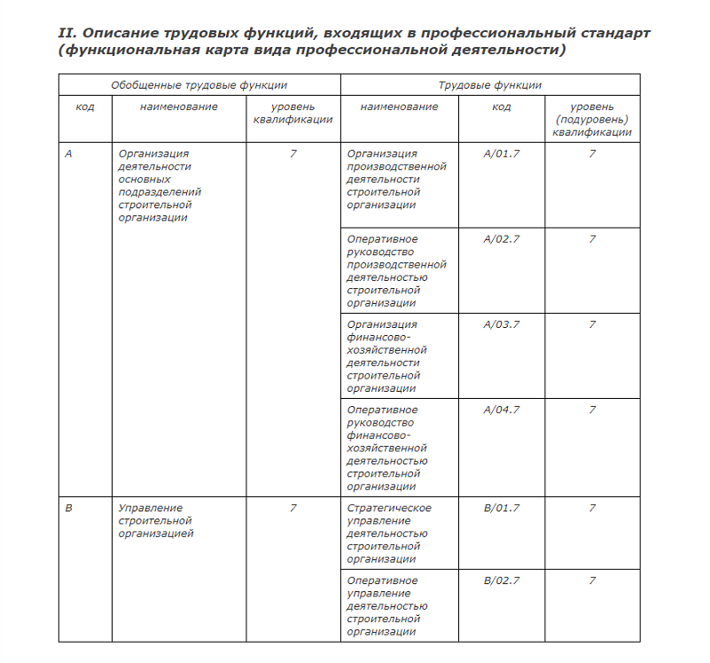 Раздел о трудовых функциях имеет следующий вид: