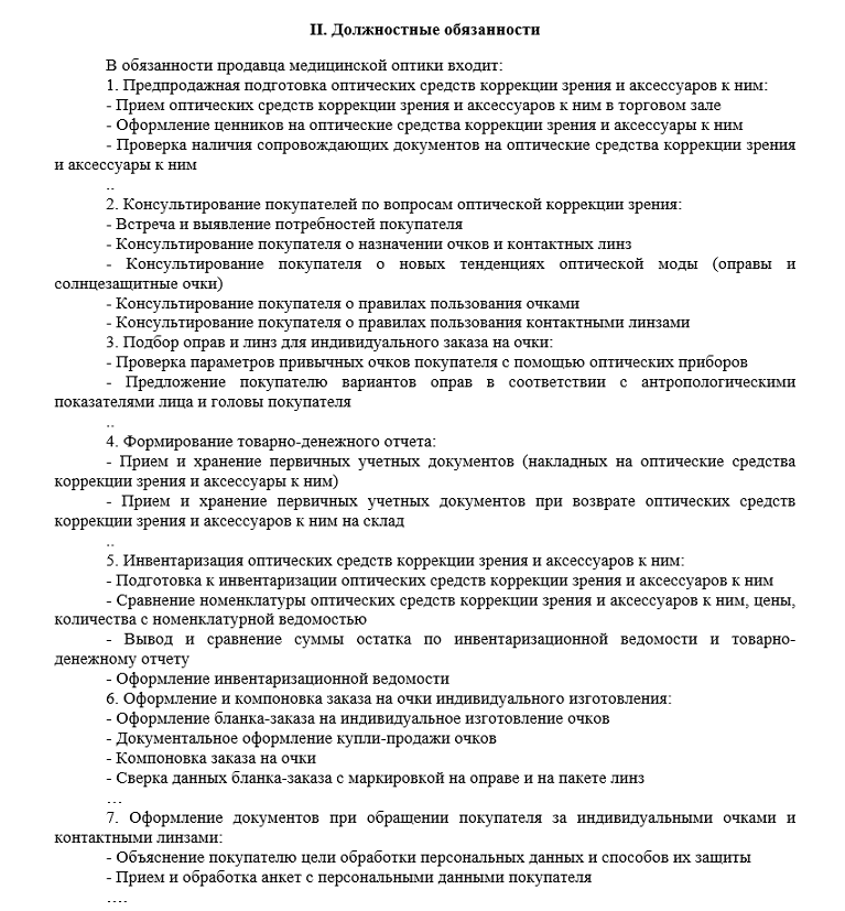 Описанные в соответствии с профстандартом, должностные обязанности на рабочем месте продавца-консультанта оптики могут иметь и традиционный вид. Главное — следование требованиям стандарта и наличие ссылки на его использование.