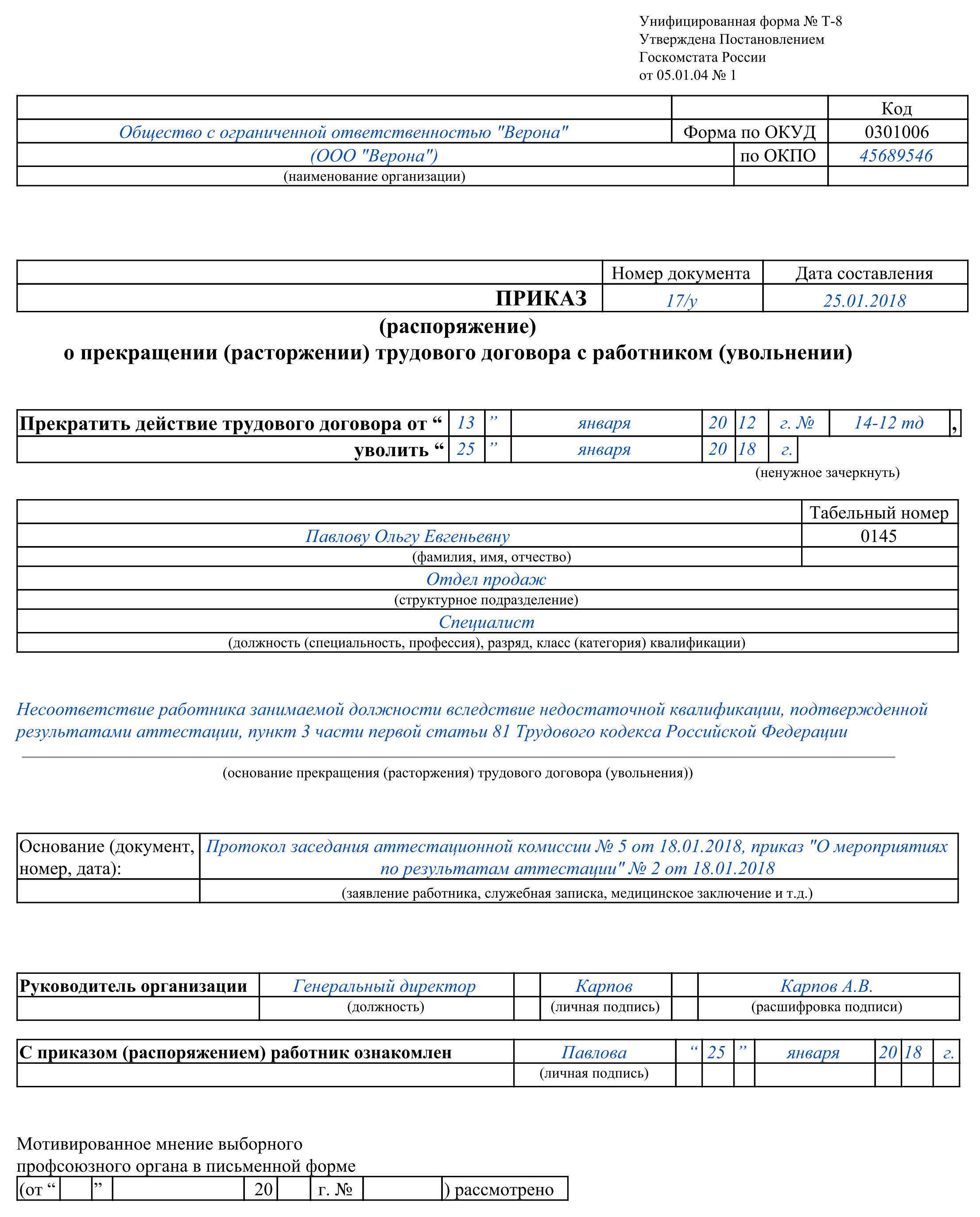 - В числе прочей обязательной информации — личные данные увольняемого, его табельный номер (если есть), наименование подразделения и должность.