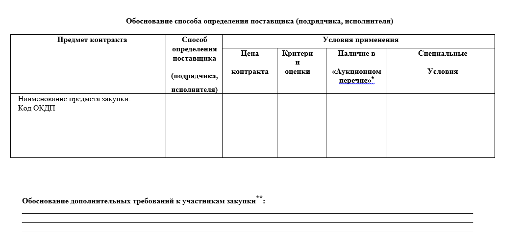 При заполнении документов планирования обязательно необходимо обосновать способ определения исполнителя (ст. 18 44 ФЗ, ПП РФ от 05.06.2015 № 555). При этом необходимо руководствоваться ценовыми критериями, объектом закупки и условиями, установленными в проектной документации контракта, особенностями выявления победителя, а также сроками исполнения заказа. Для верного составления документа, который обосновывает способ определения поставщика, заказчик должен опираться на положения ст. 24 44-ФЗ.