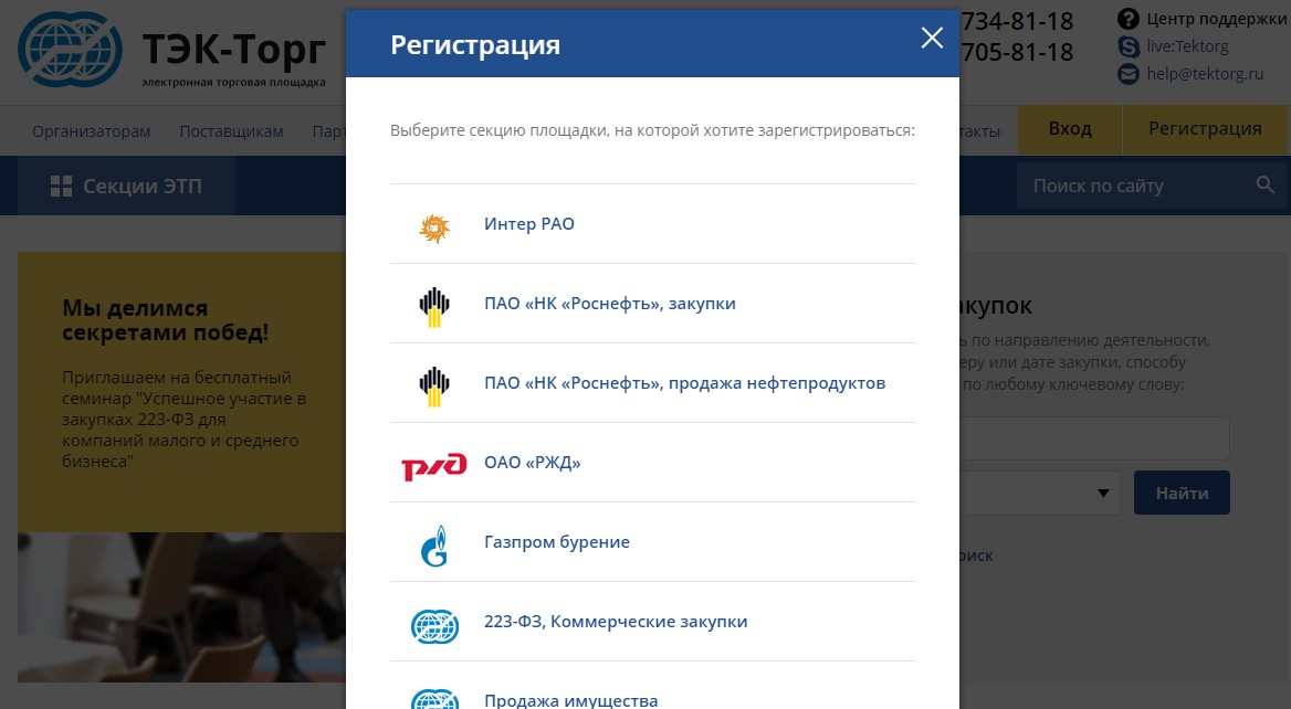 Также на площадке ТЭК-Торг действуют общая секция и секции по продаже имущества и закупкам малого объема.