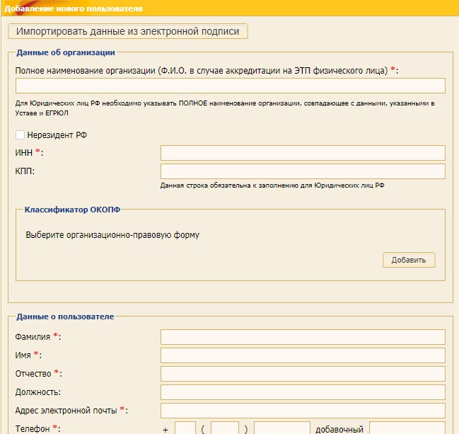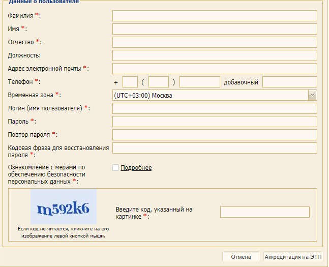Пользователю необходимо нажать на поле «Аккредитация на ЭТП» и заполнить все требуемые данные в регистрационном формуляре.