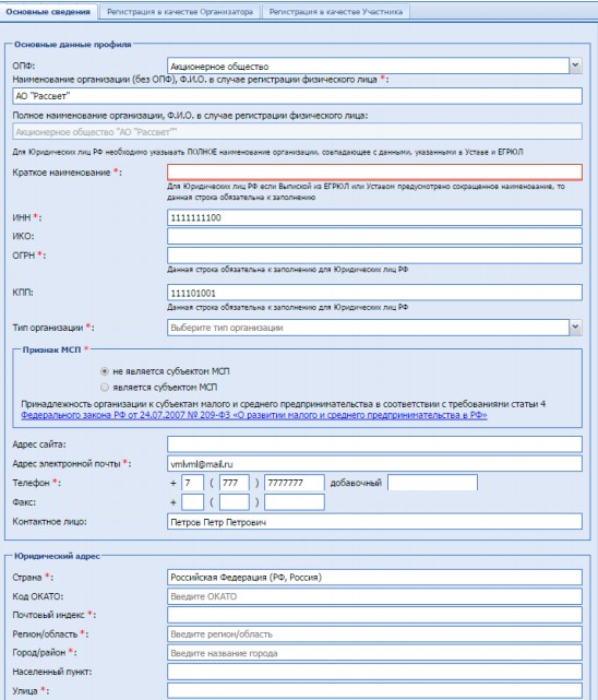 После загрузки автоматически появится формуляр заявки на регистрацию. Необходимо заполнить обе вкладки: