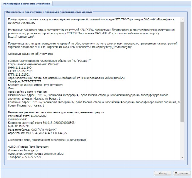 Все данные заполняются в строгом соответствии с уставными документами. После формирования заявка проверяется пользователем и подписывается электронной подписью.