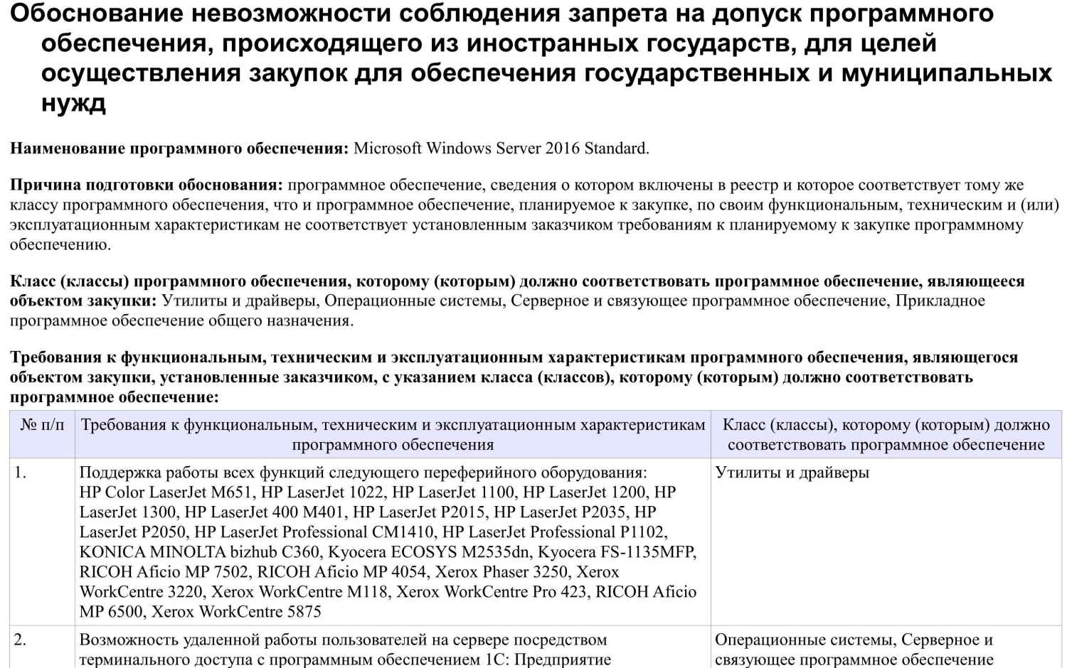 - Указание на обстоятельство, согласно которому невозможно закупить российское и евразийское ПО. Необходимо внимательно изучать реестры на наличие необходимых программ, так как в случае невнимательного рассмотрения закупка может быть признана проведенной с нарушением законодательства (Решение ФАС России от 04.10.2016 по делу № П-184/16 — заказчик указал, что сведения о необходимом ПО отсутствуют в базе данных, а именно программное обеспечение класса «офисные приложения». Однако в ней имеются сведения о 18 программных продуктах данного класса).