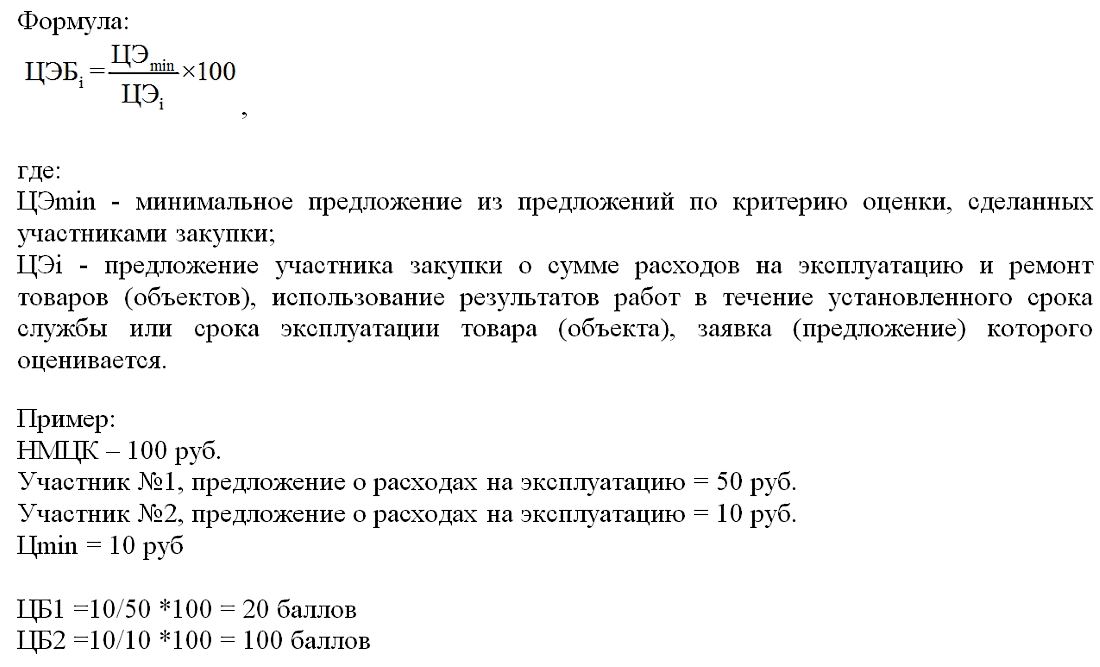 К примеру, заказчику необходимо закупить оборудование. От предлагаемой поставщиком торговой марки зависит стоимость дальнейшего ремонта и приобретения расходных материалов. Поэтому в целях экономии бюджетных средств, заказчик изначально указывает в конкурсной документации, что значительные траты на последующее использование товара негативно отразятся на рейтинге заявки поставщика. И лучшим условием исполнения контракта признается предложение с наименьшей стоимостью расходов на эксплуатацию.