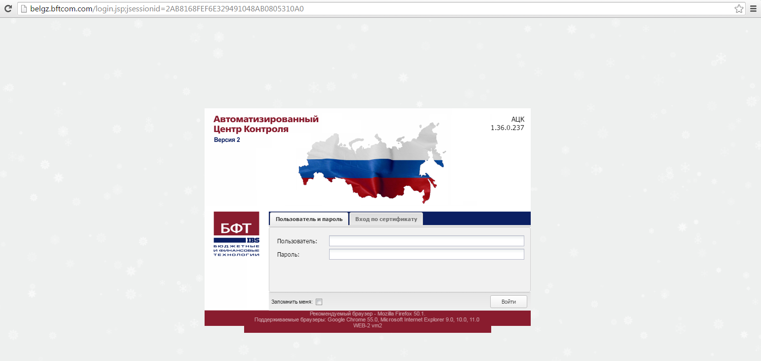 В форме авторизации нужно заполнить данные о пользователе (имя или логин) и пароль. Далее осуществляется вход. Если при вводе данных система распознала зарегистрированного пользователя и пароль, произойдет вход в web-интерфейс АЦКГЗ.