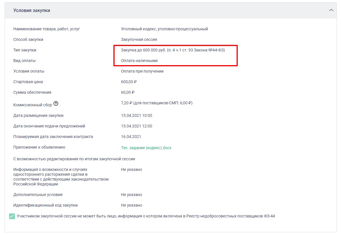 Организации проводят заказы с наличной оплатой через личное взаимодействие с единственным поставщиком или через торговые площадки. Один из вариантов — Единый агрегатор торговли «Березка» (ЕАТ). Заказчик объявляет закупочную сессию и указывает все условия тендера. В виде оплаты прописывается «Оплата наличными».