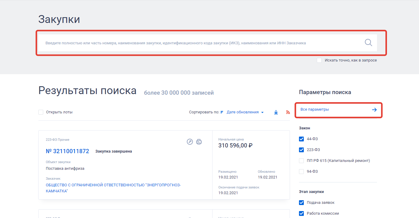 Шаг 2. Воспользоваться функциями поиска системы: ввести в строку поиска одно или несколько ключевых слов, например «защитн» или «однораз», или ограничить круг поиска тендера по тому или иному признаку, задав соответствующие параметры поиска.