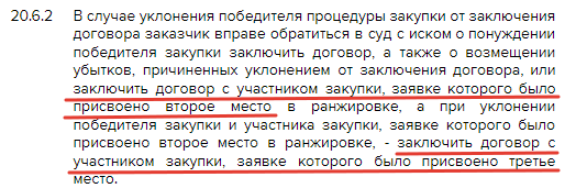 - Если победитель тендера отказывается от контракта, можно заключить договор с тем, кто был вторым.