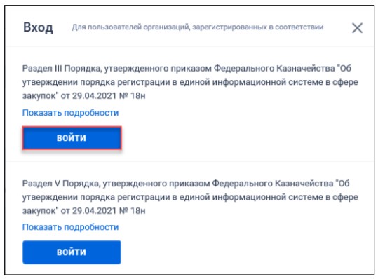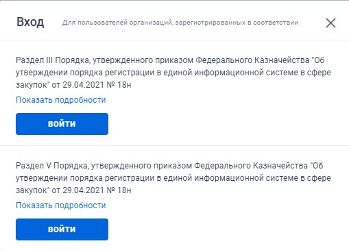 Если для организации определили только одно полномочие в ЕИС, то пользователь авторизуется в личном кабинете по этому полномочию. Если же определено два или больше — отображается предложение выбрать личный кабинет, в который необходимо войти с конкретным полномочием.