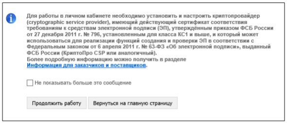 Отображается сообщение о необходимых условиях для работы в Единой информационной системе.