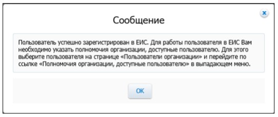 После ввода данных специалист нажимает «Зарегистрировать пользователя». Система производит проверку на предмет полноты и корректности введенных данных и при отсутствии ошибок направляет сообщение о подписании регистрационной формы. Вот как подтвердить полномочия пользователя в ЕИС, если они не подтверждены, — сохранить, подписать и отправить регистрационную форму с отмеченными пользовательскими полномочиями.