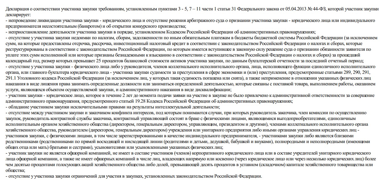 При проведении закупочных процедур заказчики устанавливают ряд условий, соответствие которым поставщику необходимо подтвердить путем декларирования. Это является обязательным условием для участия в торгах. Для этого в составе заявки подаются документы, подтверждающие соответствие участника закупки требованиям, установленным в соответствии с п.1 ч.1 ст. 31 Федерального закона №44-ФЗ, и декларации о соответствии участника (пп. «н», «о» п. 1 ч. 1 ст. 43 44-ФЗ). Это правило касается как Федерального закона № 44, так и № 223, так как существуют единые условия, которые применяются и для торгов в соответствии с Законом о контрактной системе.