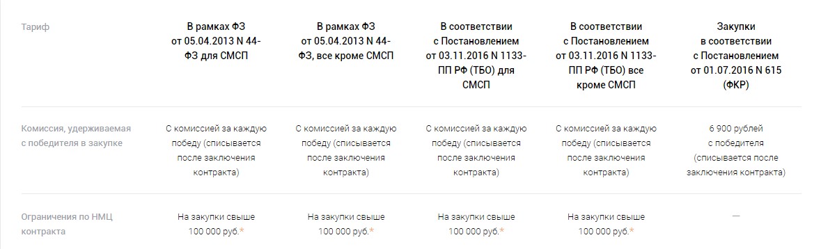 В том случае, если компания-поставщик планирует подавать заявку в торгах на секции государственных закупок по 44-ФЗ и иным нормативно-правовым актам, то расценки на участие будут следующие: