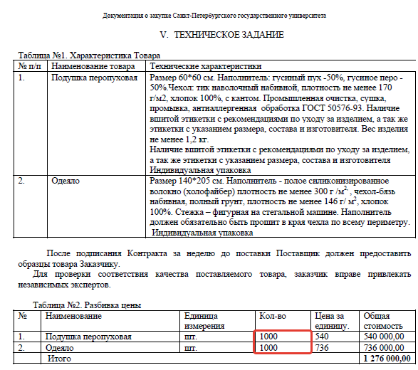 Яркий пример произошел во время закупок подушек и одеял в СПбГУ. Начальная (максимальная) цена была 1 276 000,00, на торгах падение составило почти 50 %. По итогам аукциона договор был заключен на сумму 1 261 548,00.