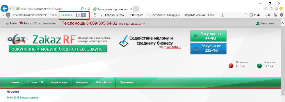 Шаг 5. При входе на ЕИС и официальный сайт торгов, программа автоматически включается. Принудительно его можно отключить кнопкой: