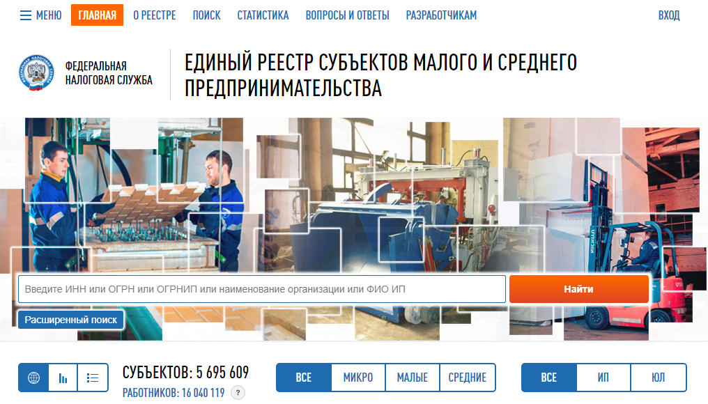 Вот официальный сайт реестра СМП — rmsp.nalog.ru. Он работает на основании ст. 4.1 Федерального закона от 24.07.2007 № 209-ФЗ.
