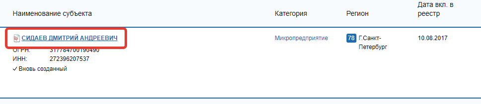 Для проверки этого достаточно, но дополнительно скачайте PDF-файл с выпиской из реестра субъектов малого и среднего предпринимательства по ИНН, в ней информация об участнике. Для этого нажмите на название предприятия или имя индивидуального предпринимателя.